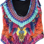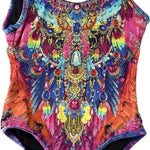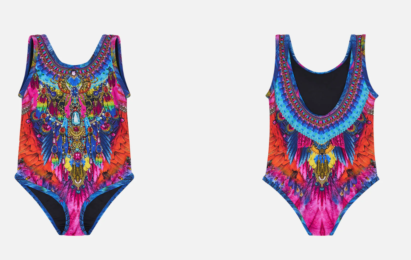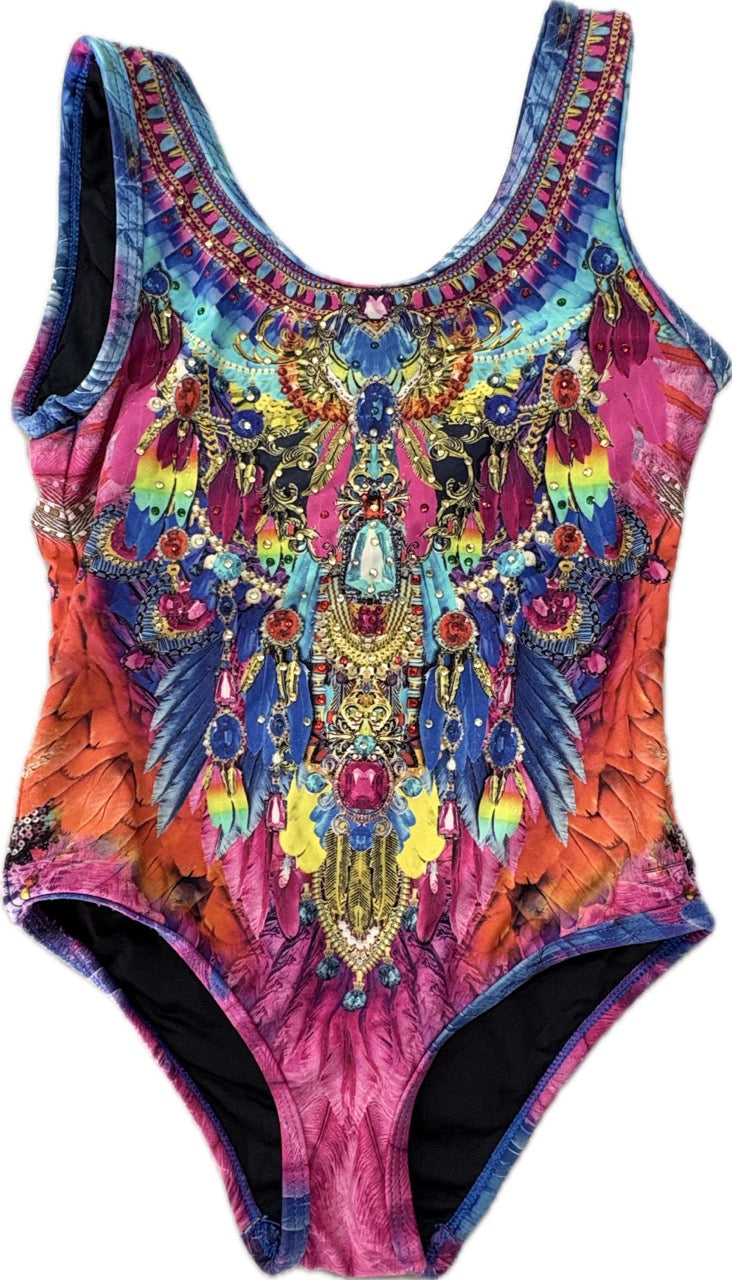 The Dancing With Destiny Kids Swim One Piece 12-14 explores a backdrop of periwinkle blue hues finished with vibrant magenta feathers, golden chain cascades and bursts of sunset accents. Crafted for days spent amidst the sun and sea, this one piece is home to a fitted silhouette that meets a scooped neckline, open back accents and hand-embellished CAMILLA adornments.