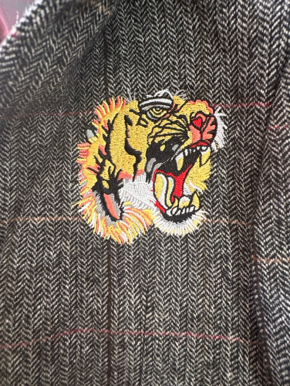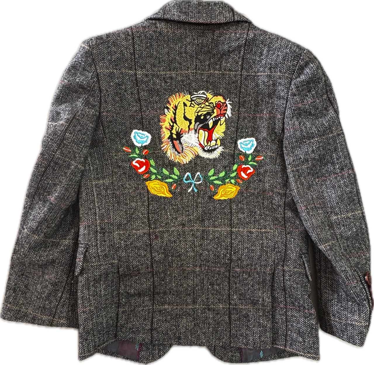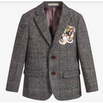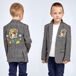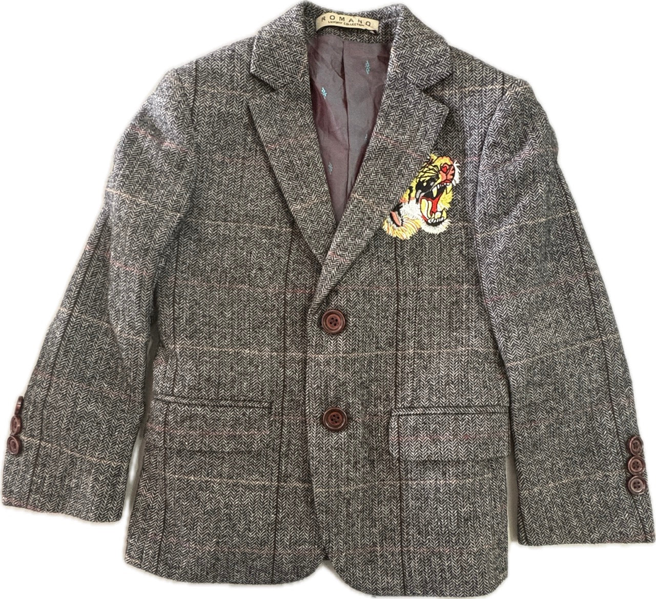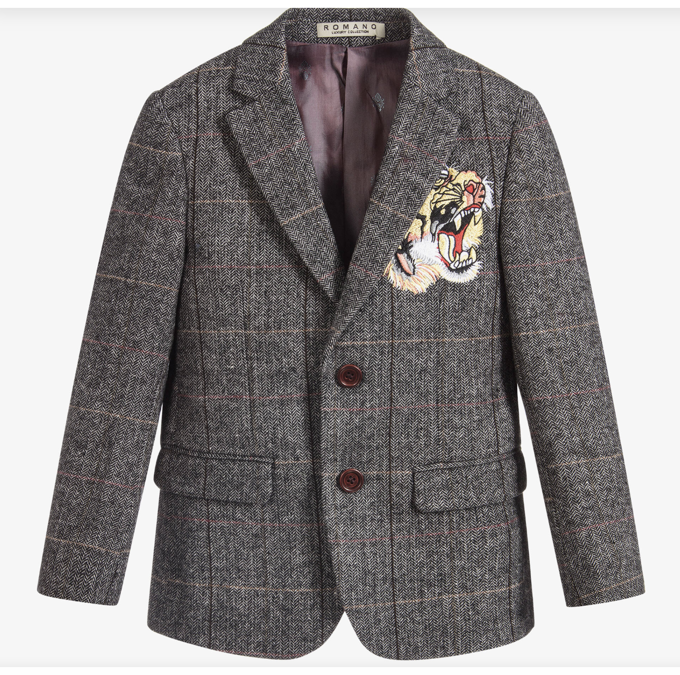 From Romano's luxury collection, this boys blazer is both smart and stylish. In grey tweed with a fine check pattern, it has eye-catching tiger embroidery designs on the front and back. It has a double vent for ease of movement, with front and internal pockets, and a beautiful silky lining.