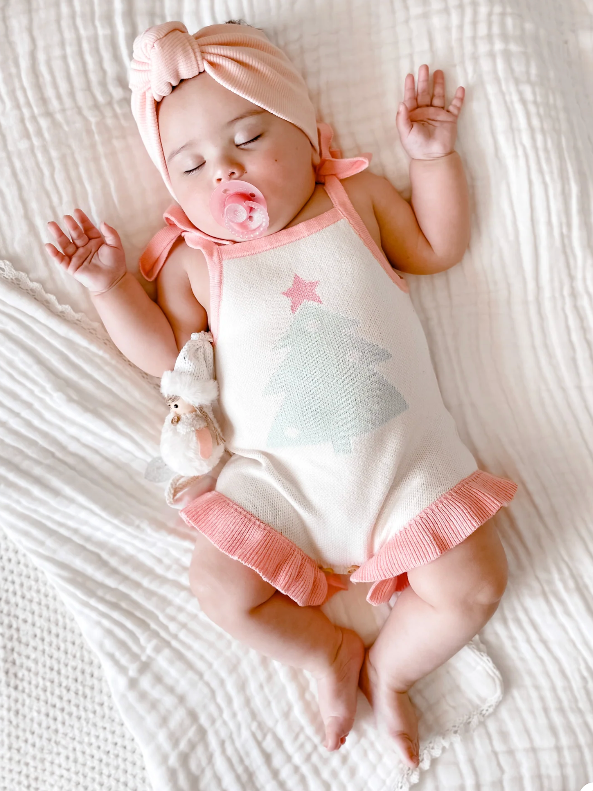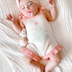 Our gorgeous Frills Knitted Romper is the perfect addition to your little ones wardrobe. Wear it with tights and a long sleeve top through winter, or on its own through summer. 3 wooden buttons for easy nappy changes and adjustable tie up straps