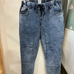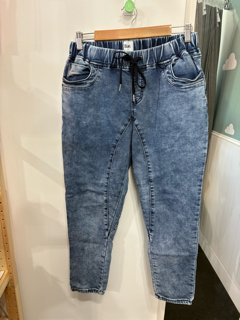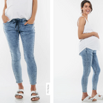 We designed these joggers so that you can get the casual vibe that denim does so well... with all the comfort of a pair of track-pants (the secret is our washed, stretch denim jersey). With a pull-on elastic waistband, they will sit below your bump during pregnancy. An adjustable drawcord allows you to tie them as necessary post-babe to make this a love affair that never has to end (!)
