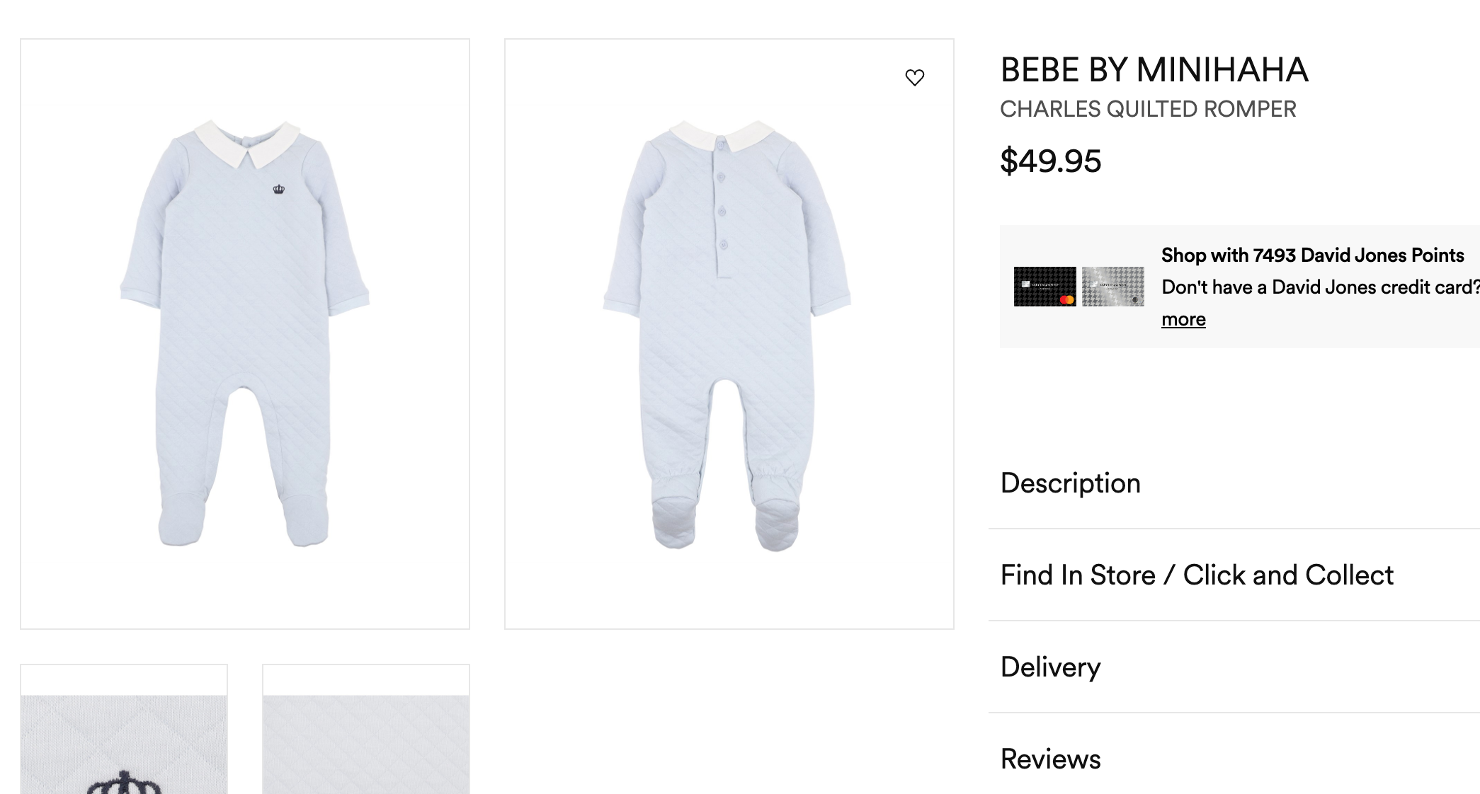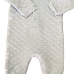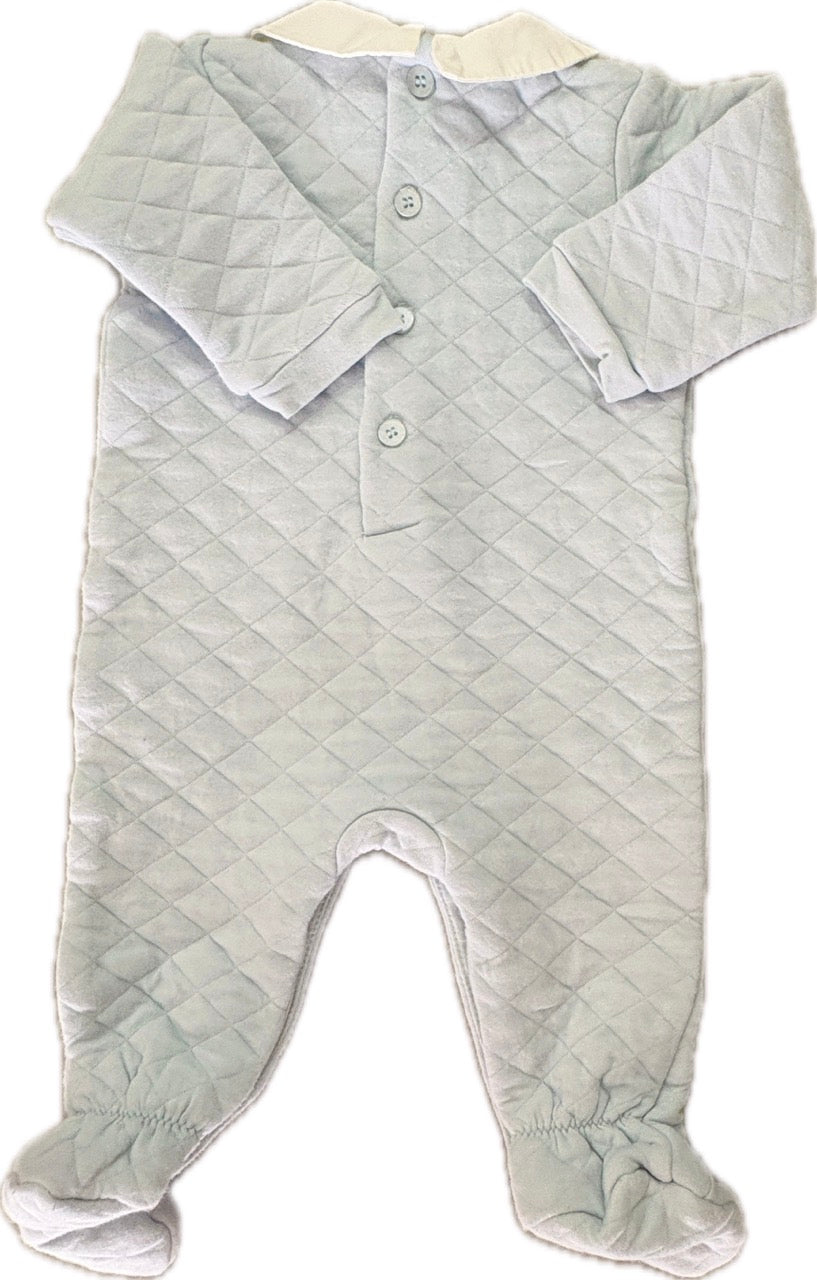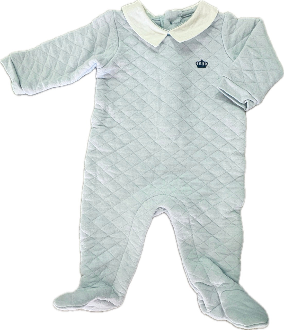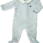 This quilted long sleeve romper features a contrast cotton collar, crown embroidery on the front chest, concealed press stud closure and buttons at the back neck.