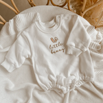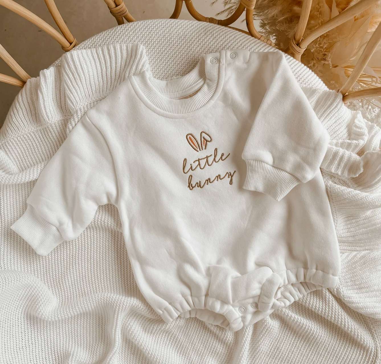 Comfort meets style with our over-sized embroidered 'Little Bunny’ Bubble Romper. Made from a soft, fleece lined 100% cotton fabric, it is the perfect gender neutral piece for your little love. Featuring snap buttons on the neck for easy changing and available in size NB-2Y.