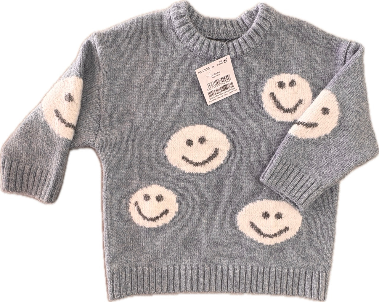 Next, Grey/Blue Happy Faces Crew Neck Jumper, NWTS, Size 1 (12-18m)
