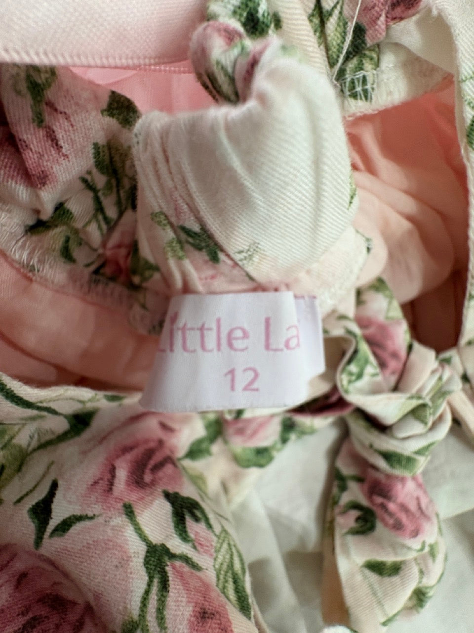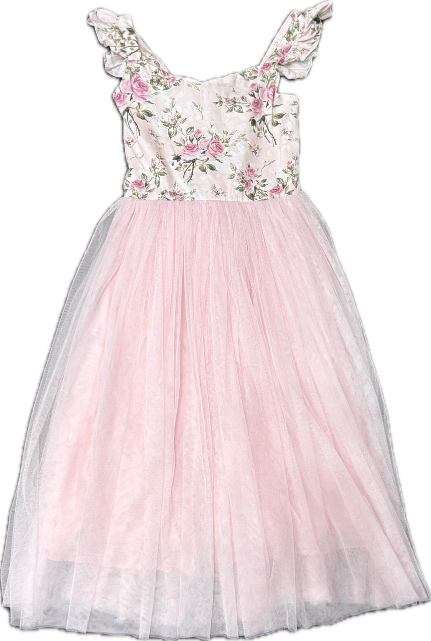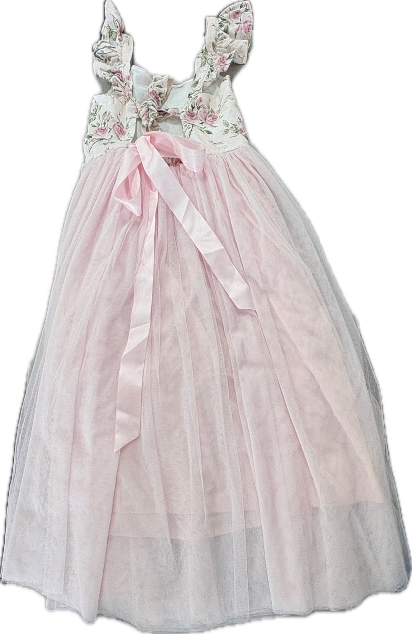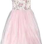 Featuring a soft floral print and tea length tulle skirt this is a gorgeous dress for any age. With pretty ruffle shoulders and a gorgeous tie-up back this dress is glamorous and sweet.