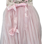 Featuring a soft floral print and tea length tulle skirt this is a gorgeous dress for any age. With pretty ruffle shoulders and a gorgeous tie-up back this dress is glamorous and sweet.