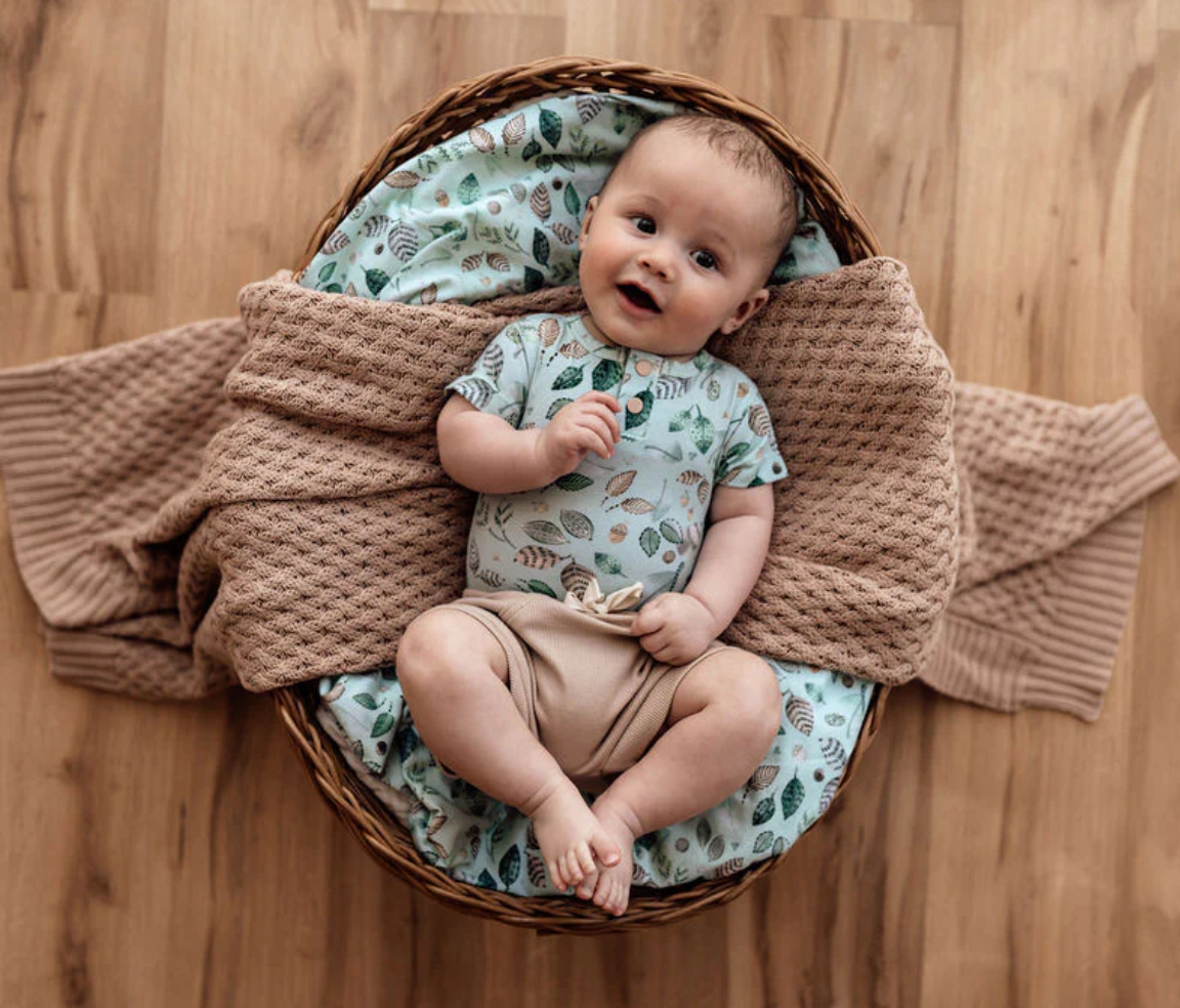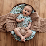 This beautiful Snuggle Hunny Daintree Baby Set includes a gorgeous Short Sleeve Bodysuit (Size 000 for babies aged 0-3 Months) and a matching Knotted Beanie (suitable for 0-6 months).