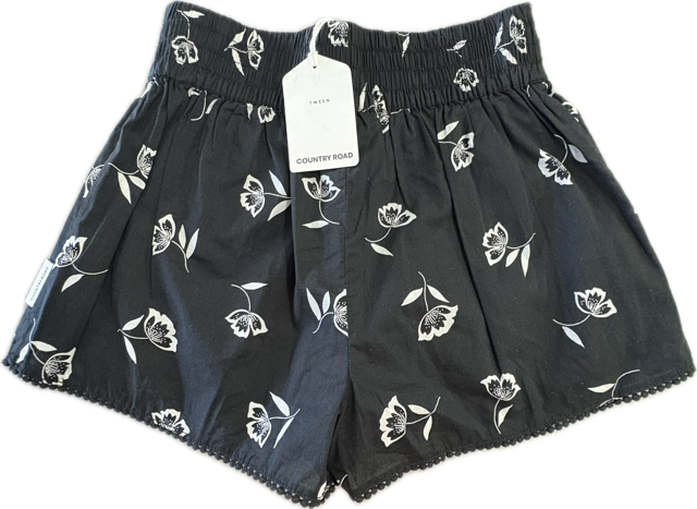 A classic cotton skort decorated in a monochrome floral print. By choosing Country Road cotton products, you're supporting our investment in Better Cotton's mission. This product is sourced via a system of mass balance and therefore may not contain Better Cotton. Model is 167cm tall and is wearing size 14. This style features a floaty silhouette with an elasticated back waist and bobble trim. 100% Cotton