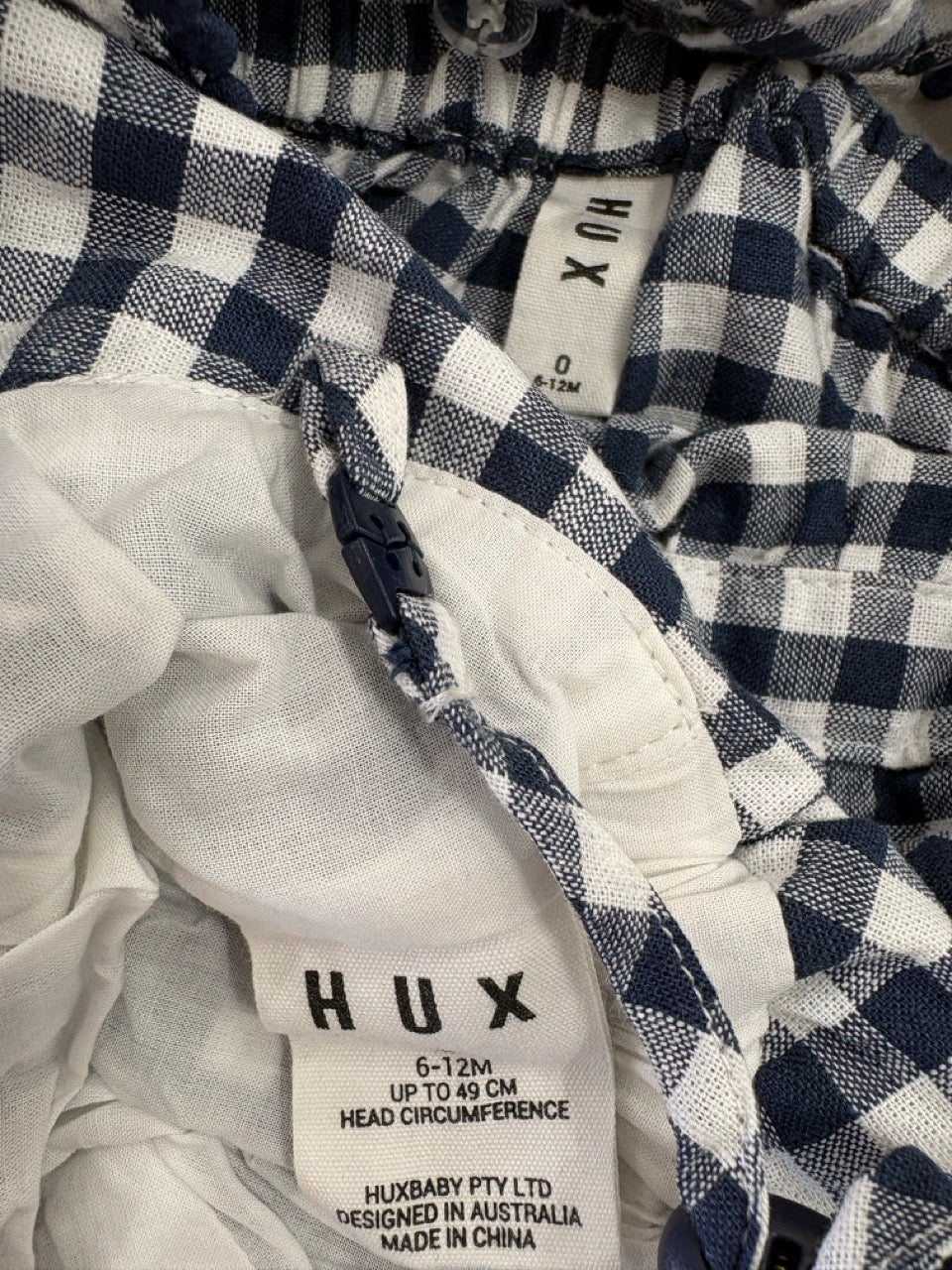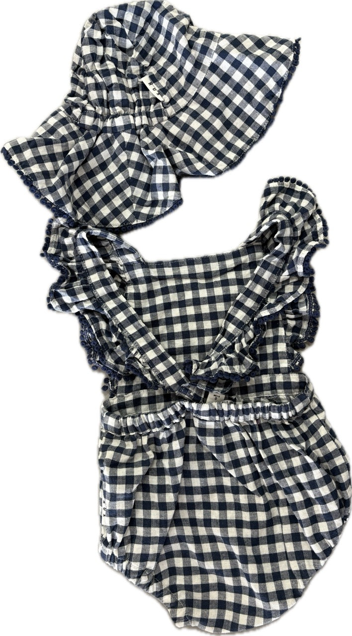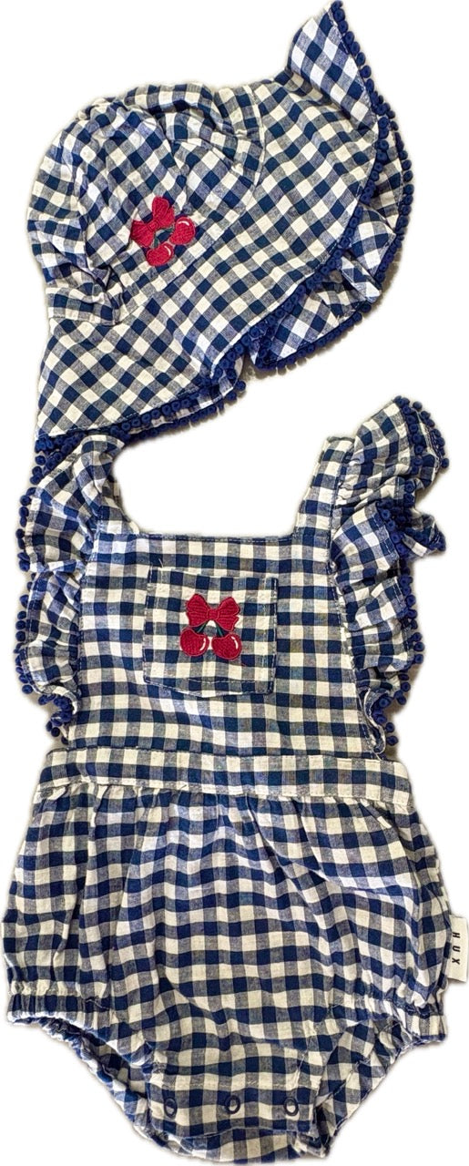 Hux Baby, Frilly Playsuit Cherry Pie Check + Hat, EUC, Size 0 (6-12m)