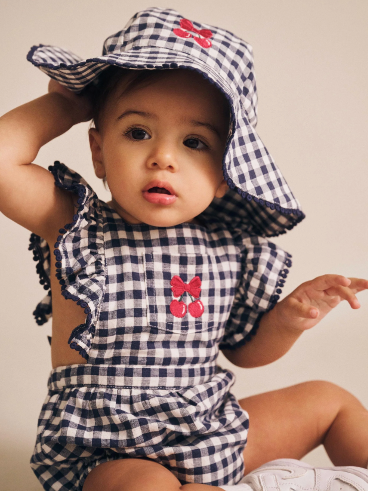 A hat they’ll actually want to wear. This wide brim frilly sun hat is practical and pretty. Made from soft cotton linen, it features a sweet gingham check and embroidered cherry detail. Adjustable chin strap to prevent from flying away.