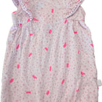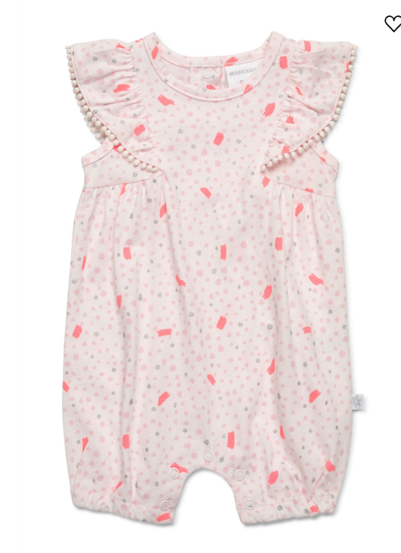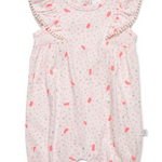 This gorgeous frilled sleeved romper. The all-over yardage print is on watermelon pink with metallic silver through it. Both the sun hat and the frilled sleeves are trimmed with tiny bobbles. This romper and sun hat are made from cotton jersey.