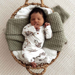We have also included foldable hand mittens for newborn to 6 months. Hand mittens help stop little nails from scratching and also keep hands warm when the weather is cool. Bub can wear the mittens open or closed. For sizes from 6 months upwards, the mittens are replaced with a stylish cuff. Foot mittens are also an important feature and these are included on all sizes. Who doesn’t love to tuck in those little feet for bedtime to keep warm?
