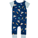 Featuring the watercolour hand painted all-over Sprinkle Galaxy print. Colourful and full of fun, this romper features pale blue short sleeves and leg cuffs to balance the deliciously colourful print!