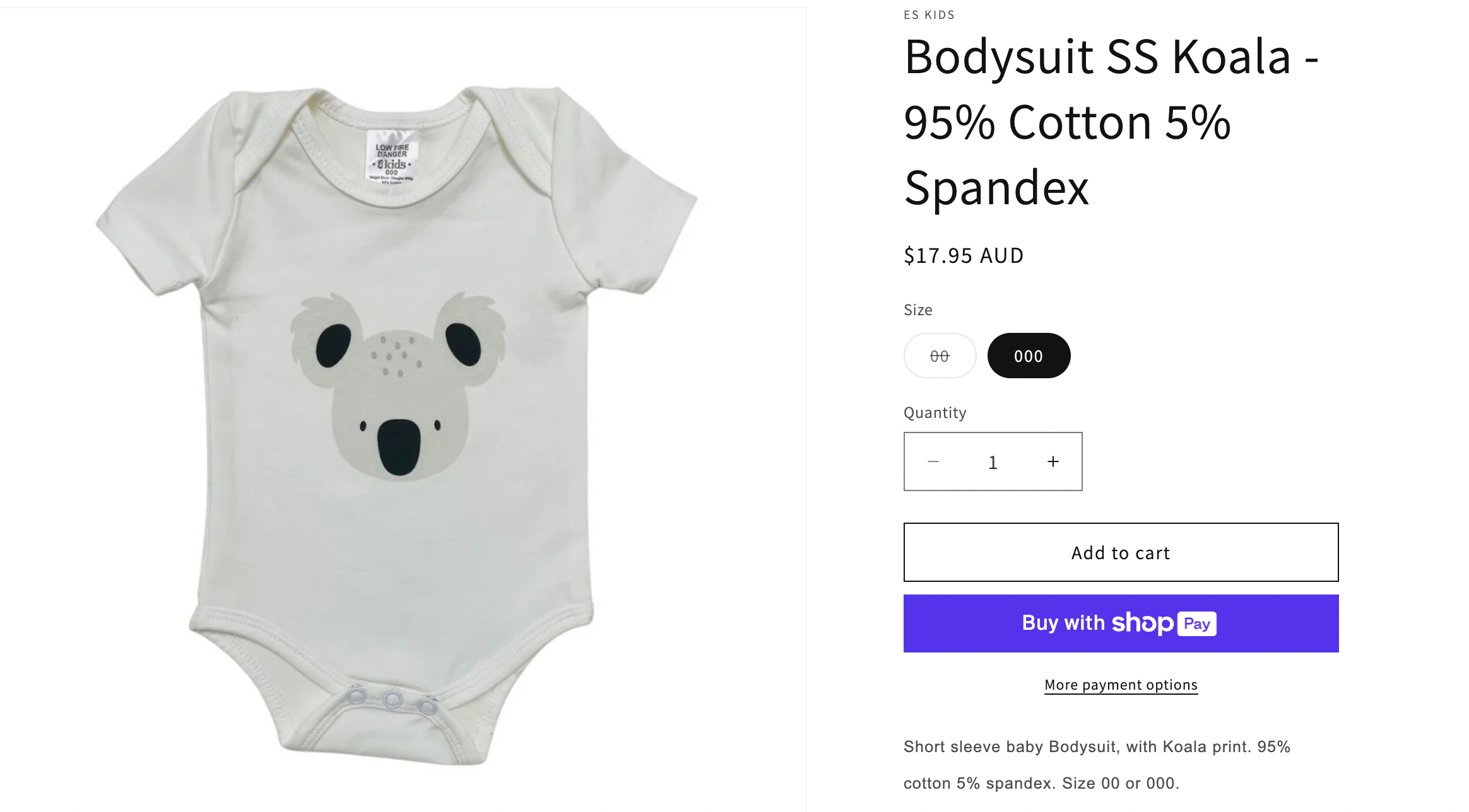 ES Kids, Bodysuit SS Koala - 95% Cotton 5% Spandex, GUC, Size 000 (0-3m)
