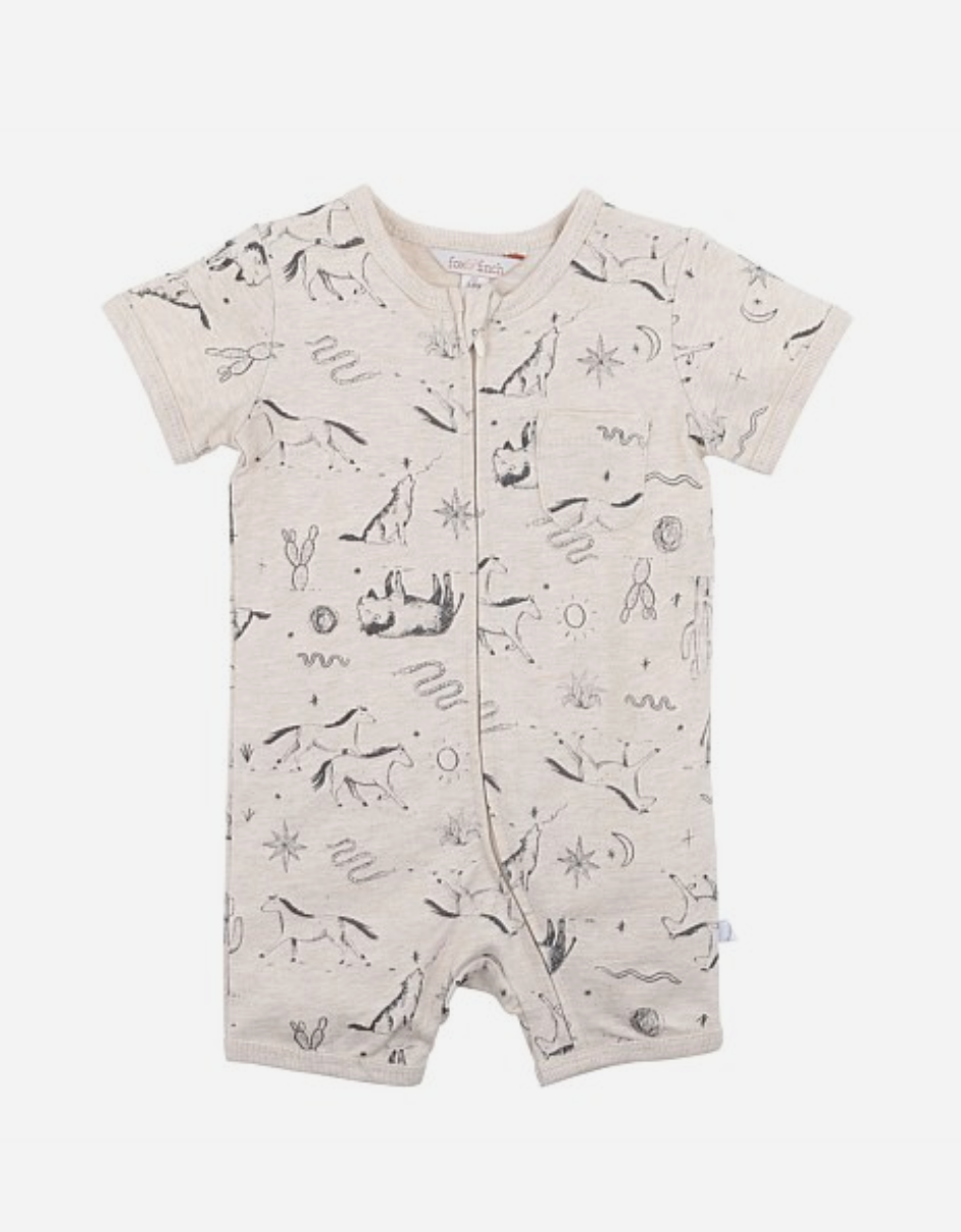 This short sleeve short leg romper features desert flora and fauna print, contrast binding, a front chest pocket and a front zip for easy dressing.