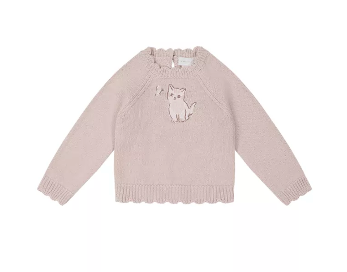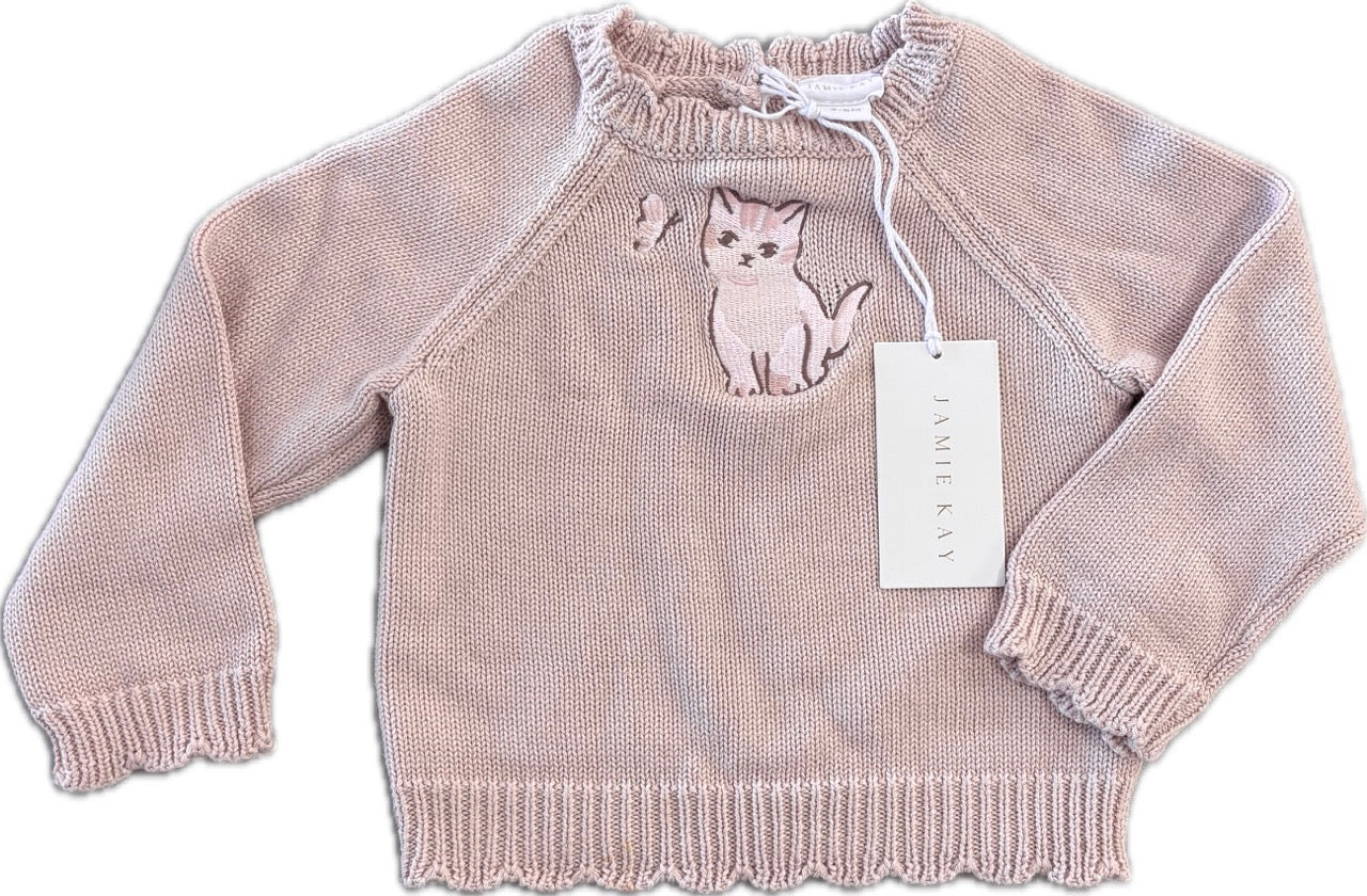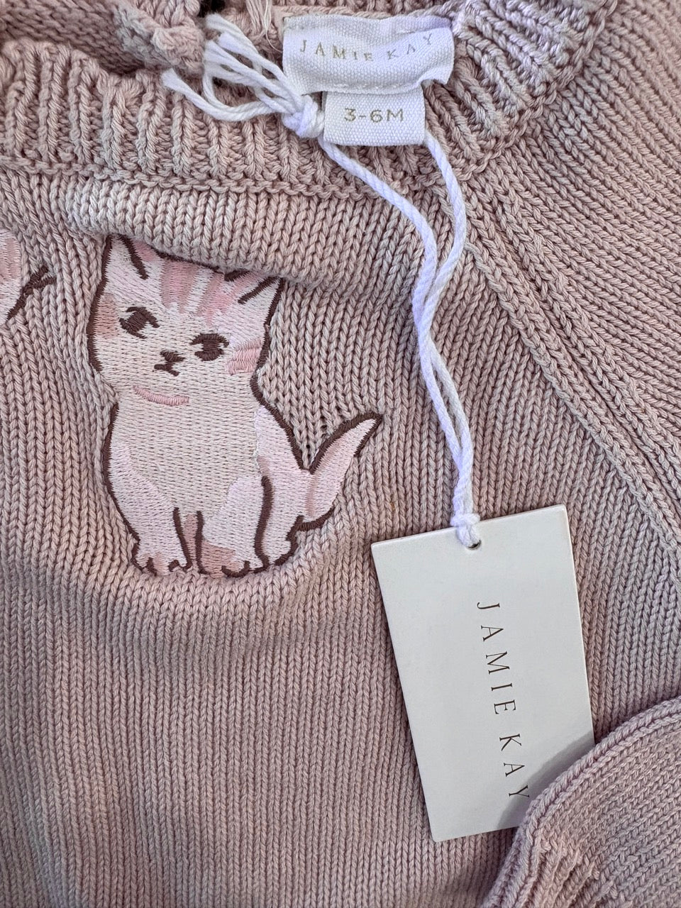 A sweet soft pink sweater with an adorable kitty and scalloped neckline, cuffs, and waist.