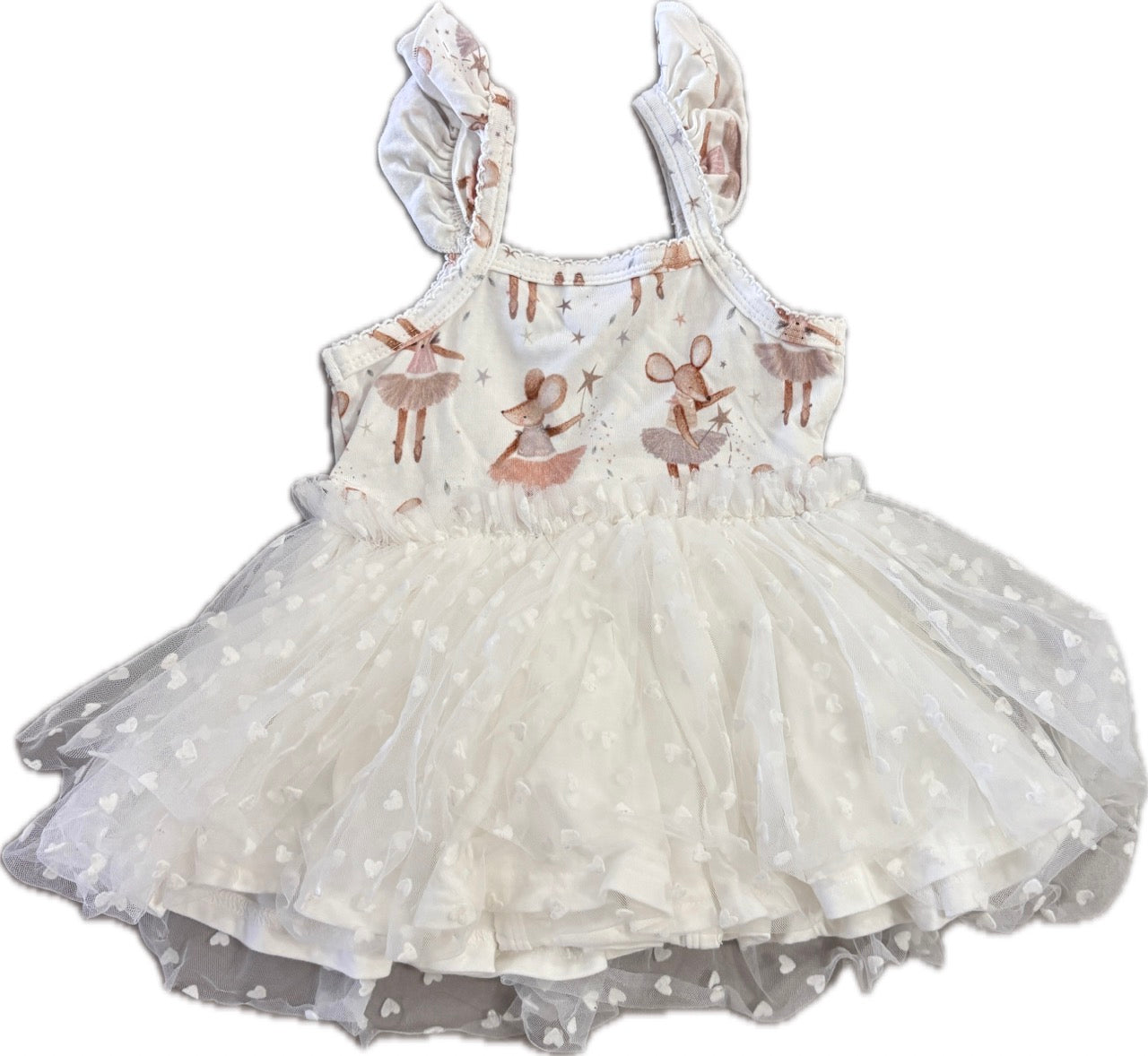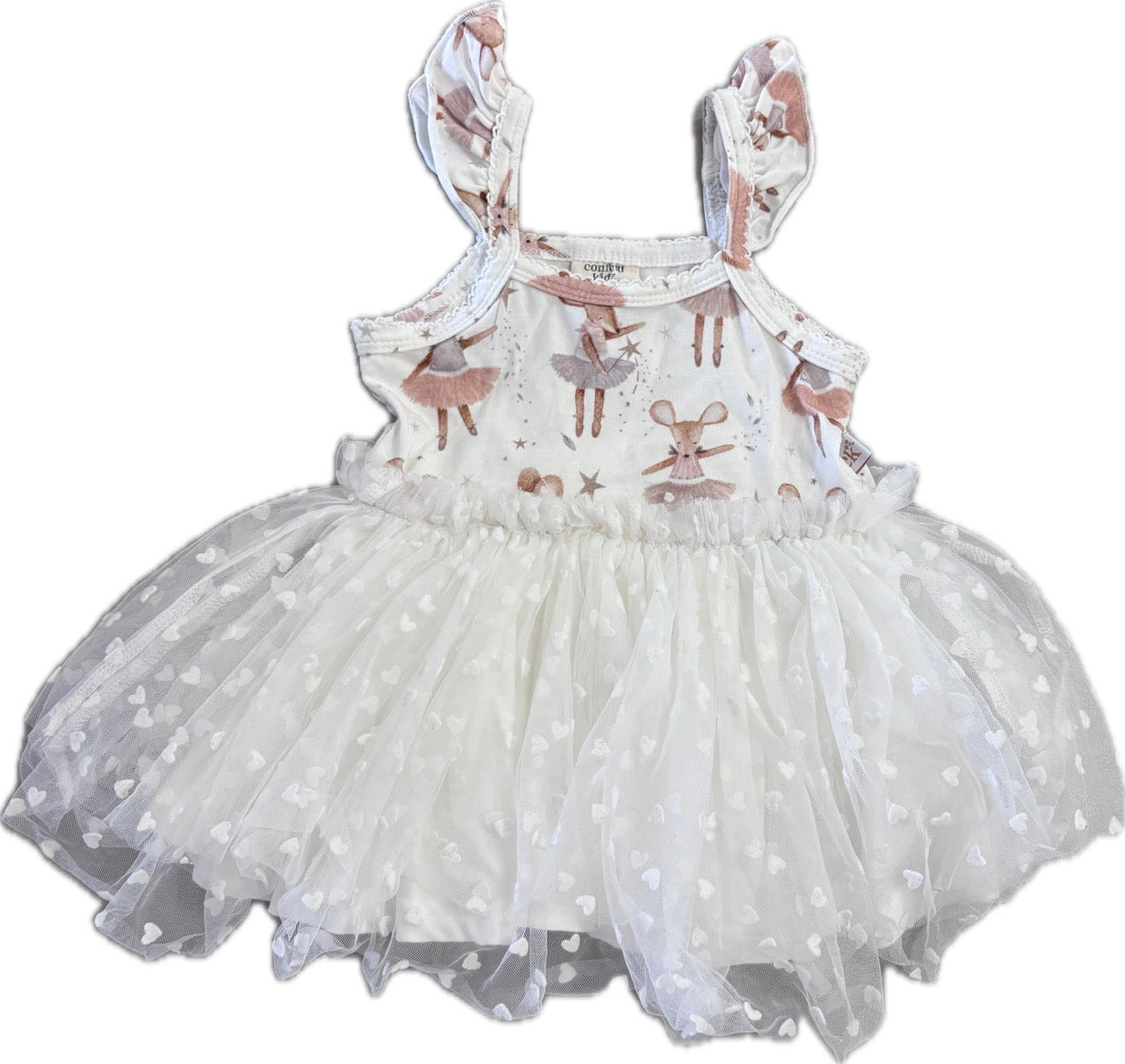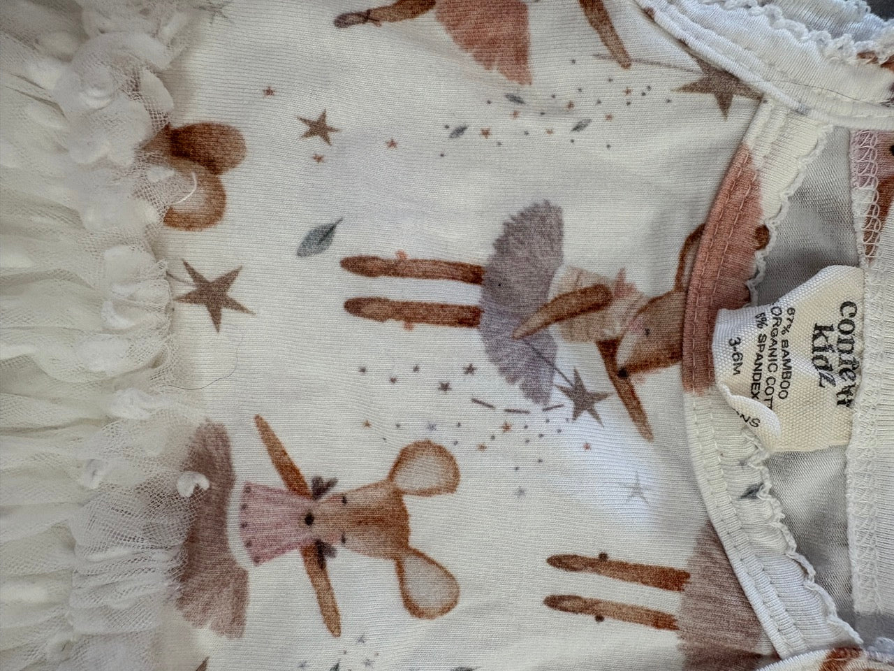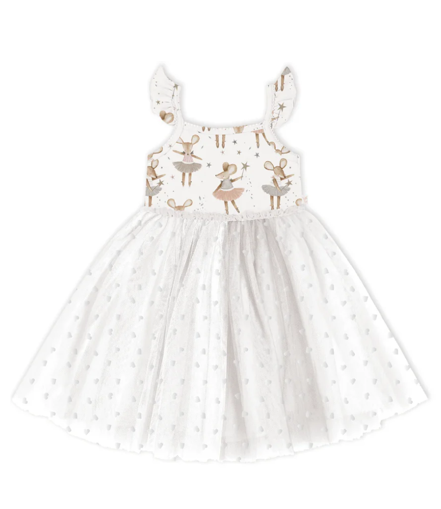 Fabric: The ribbed tulle dress features an ultra-soft bodice crafted from a blend of bamboo and organic cotton, lined with solid bamboo for extra comfort. The skirt boasts three full layers of tulle, adding a gorgeous, voluminous flair.