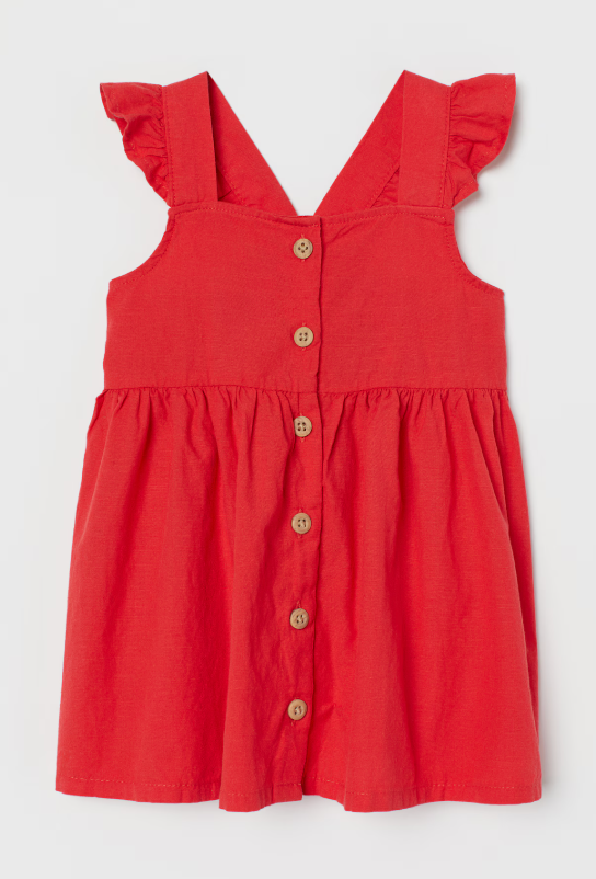 Dress in an airy cotton weave with flounce-trimmed shoulder straps and buttons down the front. Seam at the waist, narrow, covered elastication at the back and a gathered, flared skirt. Unlined.