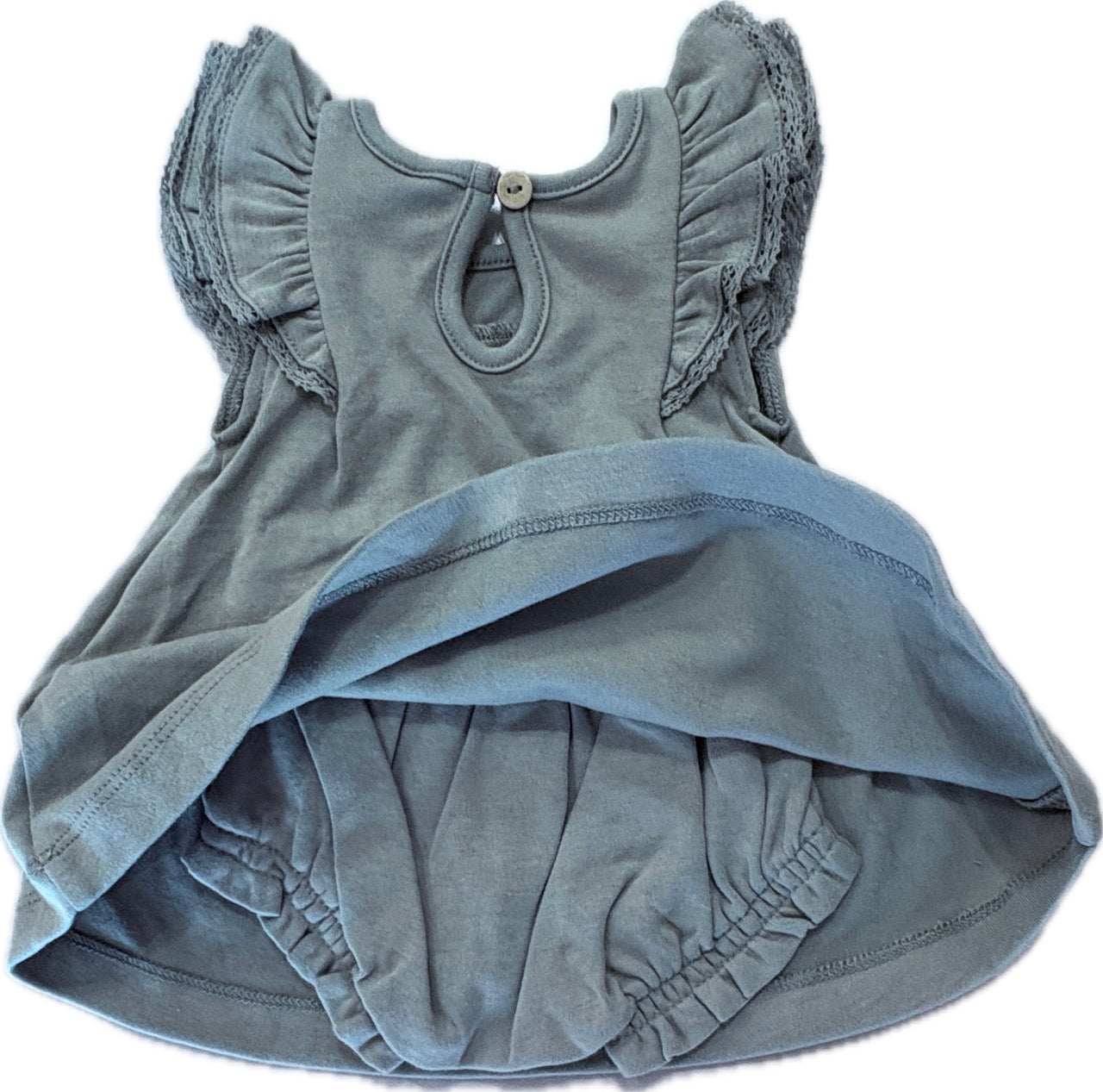 Velvety soft flutter sleeve dress with back button closure. All sizes include coordinating bloomers.