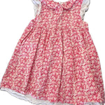 This gorgeous Liberty of London Painted print dress features contrast neck piping, puff short sleeves, a gathered skirt with a lace hem trim and a button back opening, the perfect dress for any occasion.