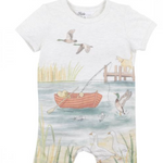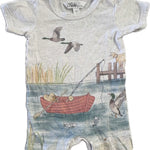 This short sleeve, short leg romper features a fun fishing print on the front, a press stud shoulder opening and a concealed press stud crotch opening for ease of dressing.