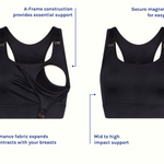 For added comfort and ease during dressing, our maternity sports bra has been cleverly designed with an adjustable back clasp, making it the perfect on-off crop, with standard and plus-size options for a perfect fit. Whilst our magnetic clasp gives easy access to the bust, the 'A-Frame' provides essential support while on the move whether you are feeding or exercising.