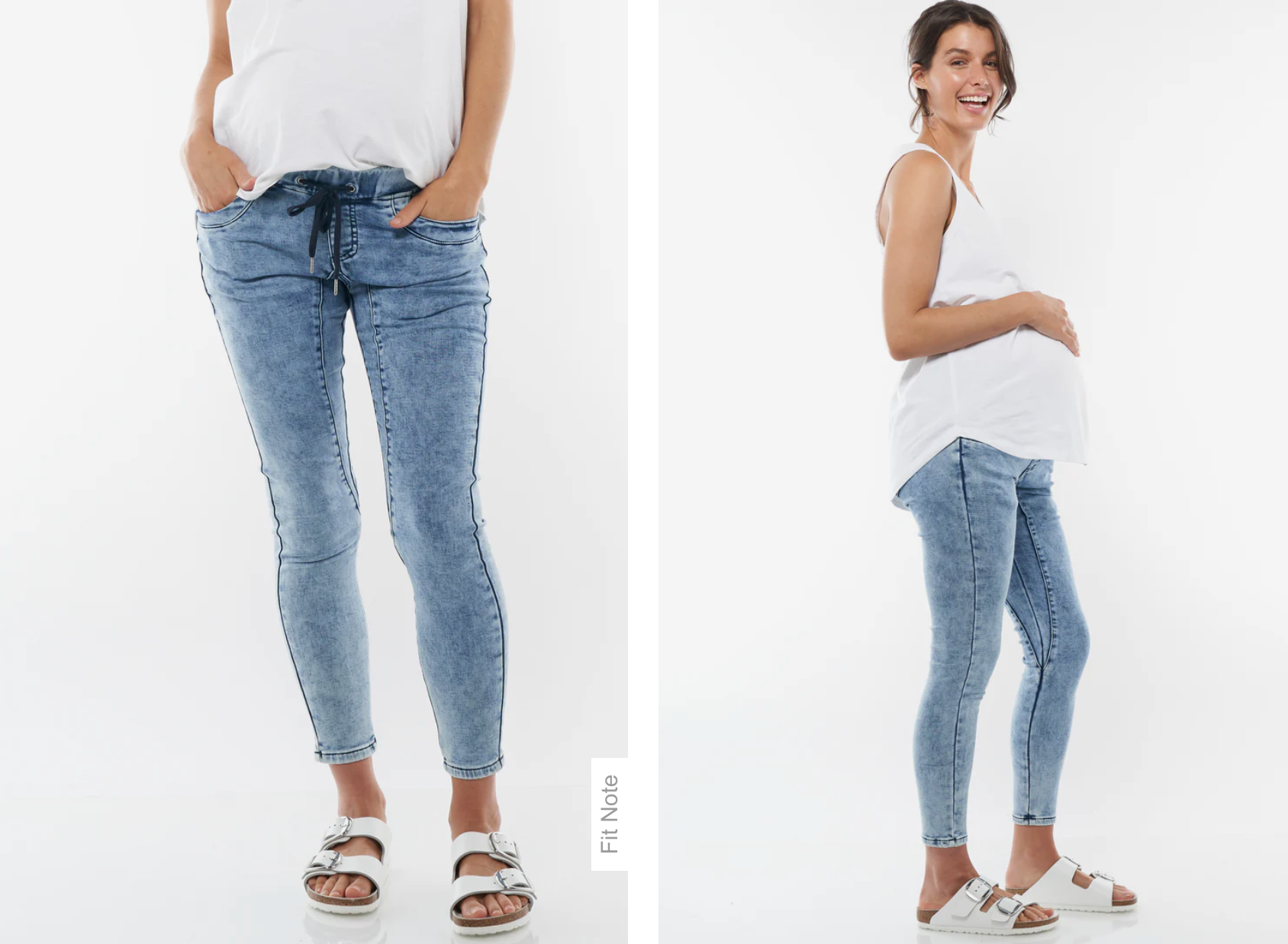 We designed these joggers so that you can get the casual vibe that denim does so well... with all the comfort of a pair of track-pants (the secret is our washed, stretch denim jersey). With a pull-on elastic waistband, they will sit below your bump during pregnancy. An adjustable drawcord allows you to tie them as necessary post-babe to make this a love affair that never has to end (!)