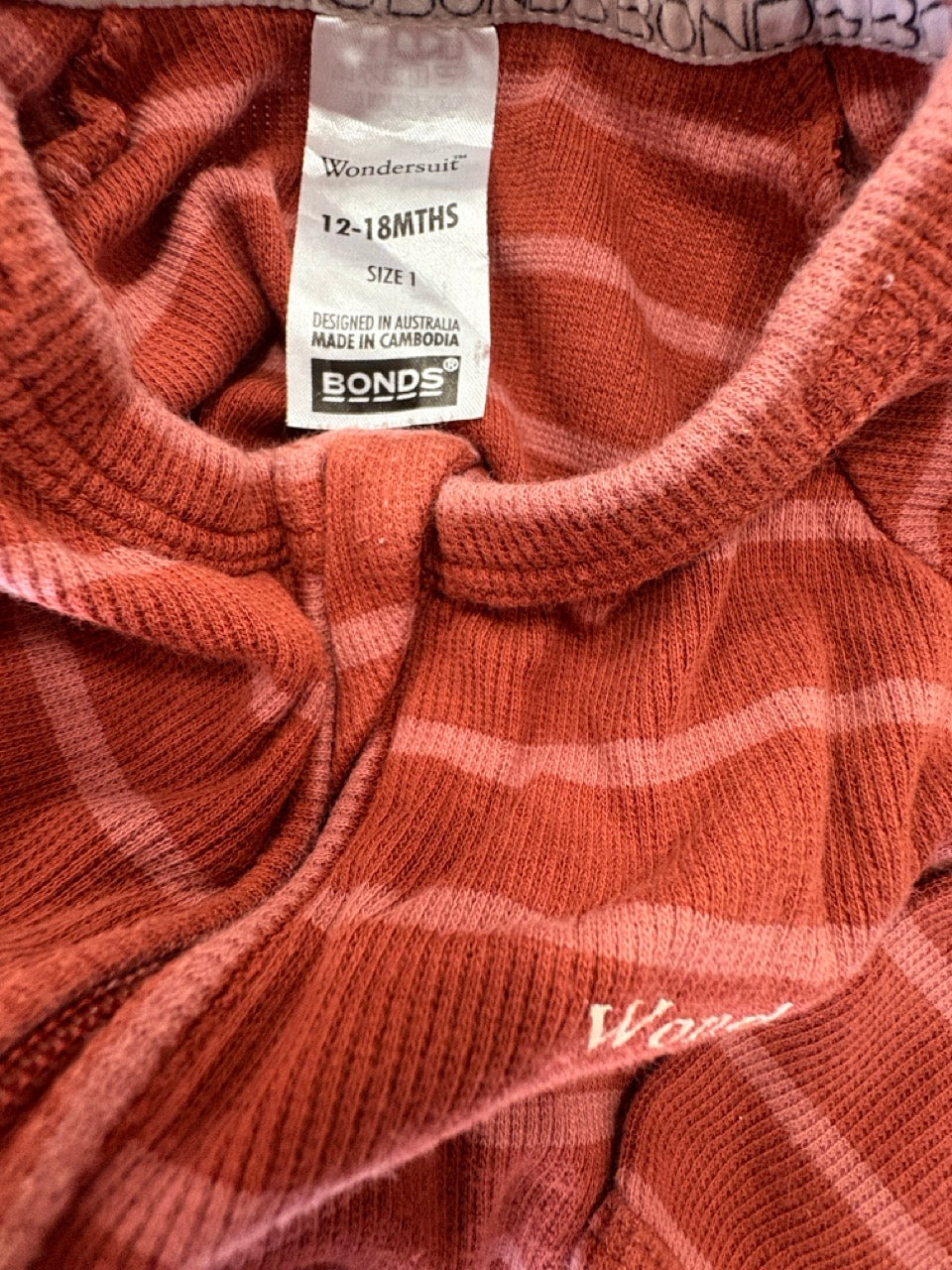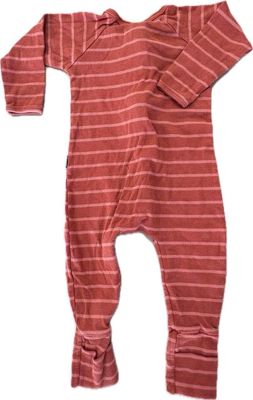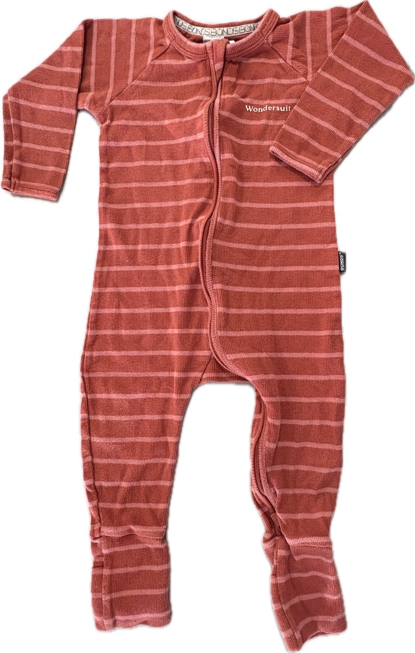 Bonds, Ribbed Wondersuit in Burnt Pink/White Stripe, EUC, Size 1 (12-18m)