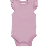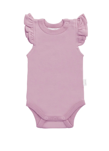 Our Organic Cotton Maddie Bodysuit – Lily is a sweet and stylish piece for your little one’s wardrobe. Featuring delicate frill shoulders and a soft lilac hue, this bodysuit is perfect for layering or wearing on its own during warmer days. Its minimal design makes it a versatile staple for any outfit.