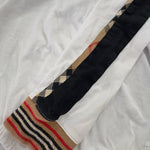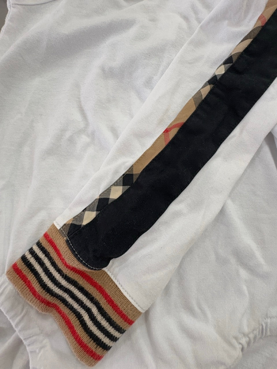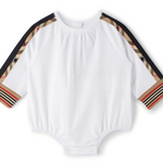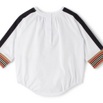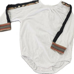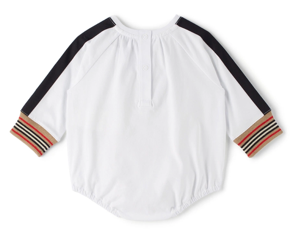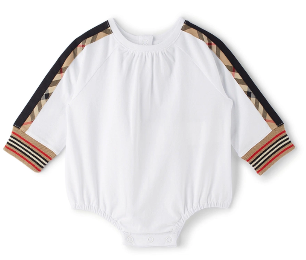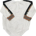 Long sleeve cotton jersey bodysuit in white. Trim featuring signature stripes and check pattern throughout. · Rib knit stand collar · Press-stud placket at front · Elasticized leg openings for a comfortable fit · Press-stud fastening at bottom for easy changing · Machine wash Supplier color: White Burberry Size: child's height 1M: 22 / 56 cm 3M: 25 / 63.5 cm 6M: 27 / 68.5 cm 9M: 29 / 73.5 cm 12M: 31.5 / 80 cm 18M: 34 / 86.5 cm 24M: 36 / 91.5 cm