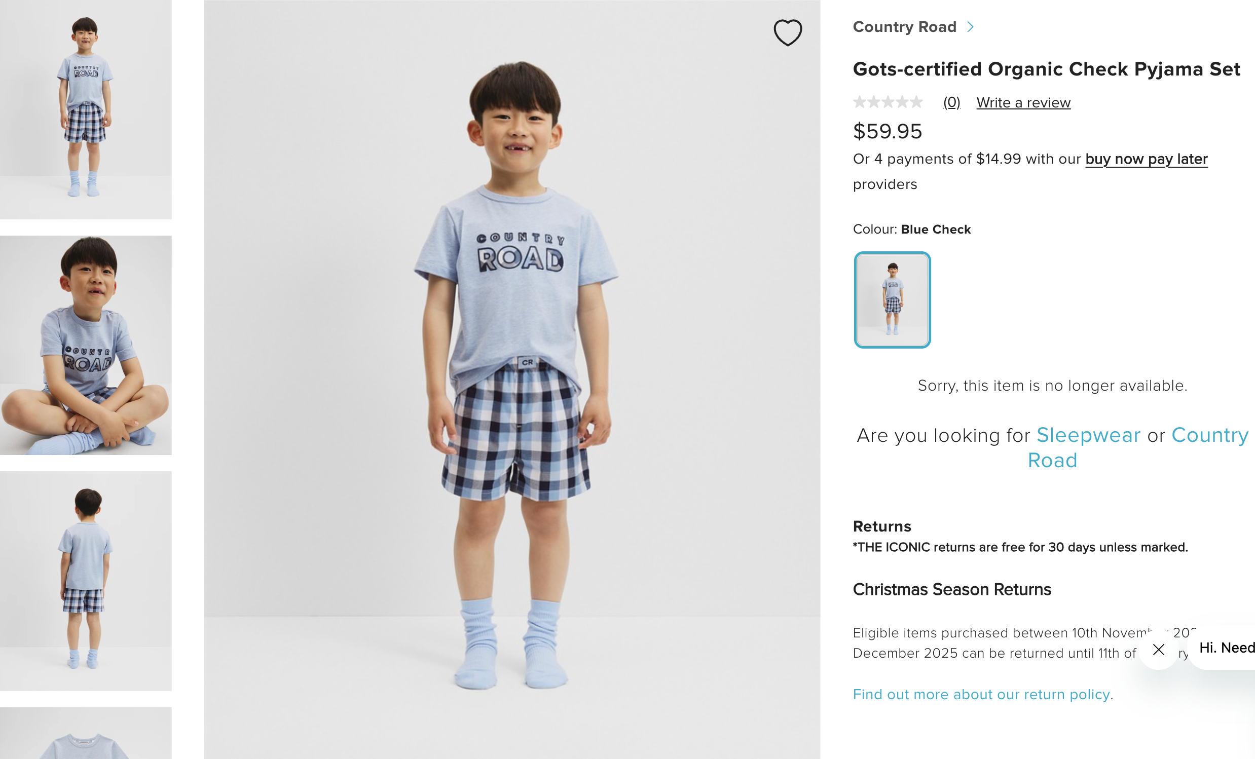Country Road, Gots-certified Organic Check Pyjama Set, EUC, Size 12