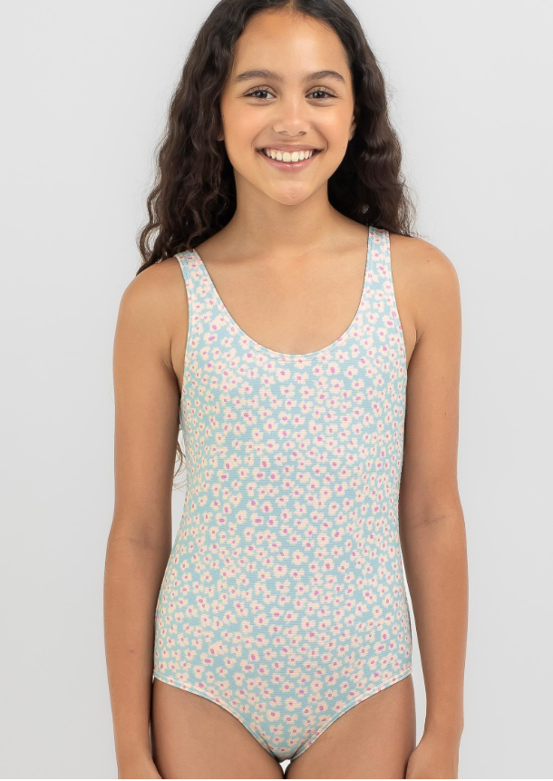 The Roxy Girls' Flower Bed One Piece Swimsuit in Aruba Blue features a vibrant blue hue, perfect for pool days and beach adventures.